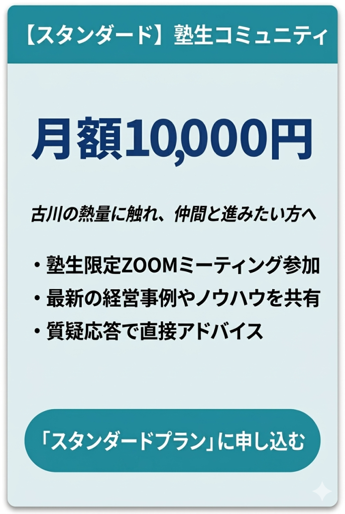 起業後すぐに古川塾に入塾! 戦略的に店舗エリアを見極め、地域一番店を目指して毎月ニュースレターを配信。 その結果、案件の依頼が増加、確実に売上を上げ続けています。地道な活動が成果の秘訣!地域密着型ビジネスで成功を目指す経営者必見の内容です。ぜひご覧ください。